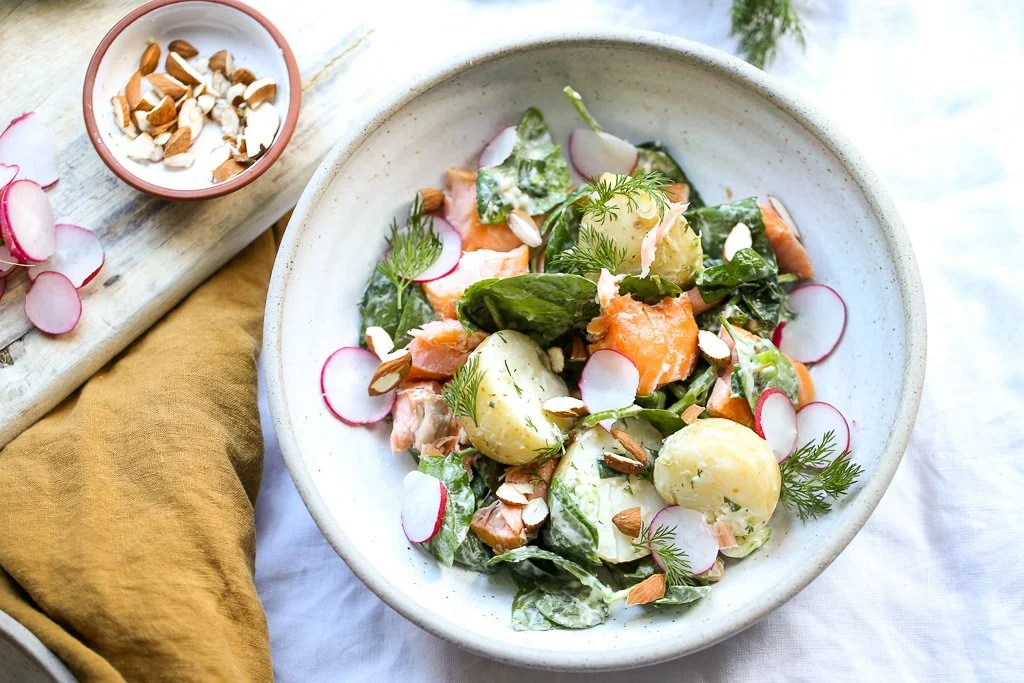Smoked Trout, Spinach and New Potato Salad with Dill Yogurt Dressing